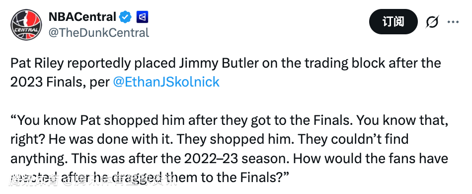 北京时间2月14日,据美记Ethan J. Skolnick报道,帕特-莱利在2023年总决赛后,将吉米-巴特勒摆上了交易货架。 Skolnick表示:“你知道莱利在他们打进总决赛后就把巴特勒拿去兜售了,对吧?他受够了。他们把他摆上货架,但没找到任何合适的交易方案。这事发生在2022-23赛季之后。想想看,在他拖着球队打进总决赛后,球迷们会作何反应?” 22-23赛季,巴特勒帮助热火在季后赛中相继淘汰雄鹿、尼克斯、凯尔特人,最终和掘金会师总决赛,但最终他们以1-4不敌对手。去年2月份,当时在一笔多方交易案中,热火将巴特勒送至勇士,随后巴特勒和勇士签下了一份2年1.21亿的续约合同。